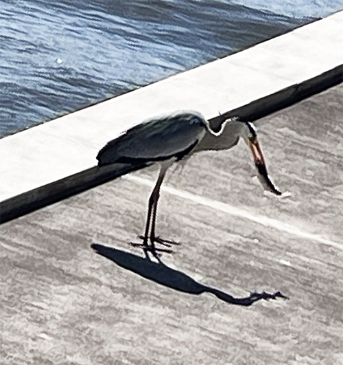 The fish swallows and eats its prey after it returns to the location where it was based for the sortie. Yesterday, the fish could not swallow immediately and had to spit it out on the ground, then feed on it again with its beak before swallowing it. In my imagination, it appeared that the fish was too energetic to swallow immediately, so it was not able to go down the throat quietly and let its energy wane a little before converting it from prey to food and eating it.