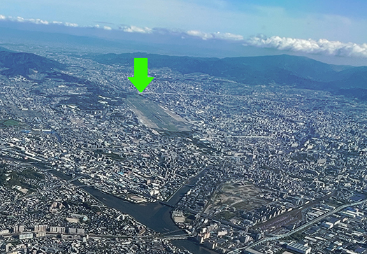で、午後3時過ぎには博多の街から福岡空港に地下鉄で移動。博多駅から2駅で到着するという全国的にも珍しい「街中空港」なんですね。伊丹よりも都心的な便利さ。写真はフライト早々に飛行場を「見返した」アングルで⬇を付けましたが、周囲にはびっしりと住宅地が立ち並んでいる。こういう環境でも大過なく運用されてきている関係のみなさんのご努力に深く敬意を持ちます。