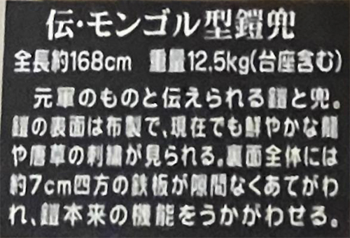 2枚目の写真の通り、168cmの長さ・12.5kgの重量。鎧〜よろい〜の表面は布製で今に至っても色鮮やかな龍や唐草の刺繍デザインが施されている。裏面全体に7cm四方の鉄板が隙間なく装備され、鎧としての優れた機能性をうかがわせる。〜という解説。
