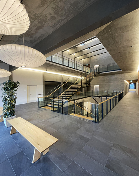 On the inside, upon entering the smaller entrance, the entrance was a large atrium space with outside light coming in from the ceiling. The interior of the building is accented with a corridor on each floor of the atrium and a staircase with wooden steps built at a generous angle. Although it is a public building, it was designed with aesthetics in mind.