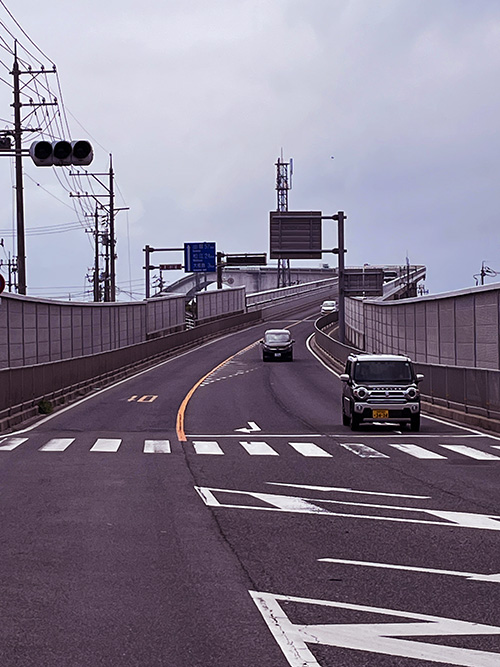 We understood that it means a severe slope bridge where you have to keep stepping on the gas pedal all the time. We set off, hoping to take some “eiyoe” photos of the bridge. However, we had to rely on the car navigation system, which we didn’t know how to use. When I realized, “Oh, this is it,” I was right before the bridge on a straight road with a steady stream of following cars. I told my wife in the passenger seat to hurry up and take a picture with her iPhone, but she couldn’t get there in time.