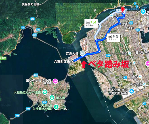 まぁそんなクルマ運転人生を送ってきて、いまでも東京〜兵庫県姫路往復などのロングドライブも平気でこなしているような人生行脚。そんなわたしなので、今回の関西〜山陰の旅も当然レンタカーでの自由ドライブ。で、カミさんと話していて興味深かったスポットがこの「ベタ踏み坂」〜鳥取県・江島大橋。