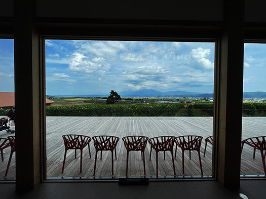 The photo shows the deck overlooking the Higashidaisetsu mountains from the store at Rokkatei in Furano, the final stop on this trip.