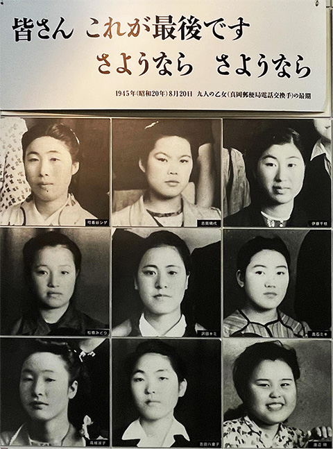 そして次の写真は、戦争終結5日後ソ連軍によって侵略攻撃された樺太・真岡の町で、電話交換はもっとも大事な仕事と当時の「緊急疎開」にも応じず職務に当たっていて無惨に「自決」した、9人の女性たちの北方記念館での展示写真。
