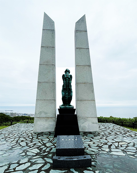 The photo shows the “Ice and Snow Gate” bronze statue located on a hill overlooking the city of Wakkanai. It is the work of sculptor Arata Hongo, a senior at the high school from which I graduated, and is a record of the upheaval in Karafuto before and immediately after the war. The following is a summary of the inscription.
