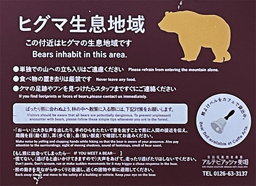 As an ordinary person, I am mindful to prioritize evacuation and escape as the sole course of action in such situations. Yesterday, I was traveling to Arte Piazza Bibai in Bibai City, about an hour and a half from Sapporo, intending to enjoy some art. However, many of the sculptures are scattered along natural paths, so there are warning signs like the one shown here at the entrance to the pathways.