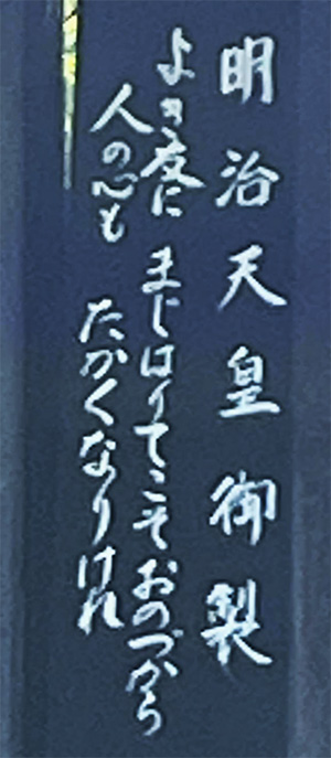 While pondering these thoughts, I came across Emperor Meiji’s “imperial poem” during my daily walk. It was quietly placed next to the “hand-washing pavilion” within the grounds of Hokkaido Shrine, and I had never noticed it before. Japanese people have used short-form expressions to convey their inner feelings to one another in such settings, and have incorporated them into a kind of behavioral norm.