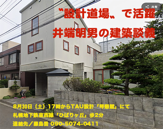 その藤島さん、たくさんの「後輩」も輩出されて北海道の建築シーンにとって大きな足跡を残されてきていますが、高齢期を迎えやや落ち着いた活動に軸足を移されているようです。「物件のメンテナンス、相談位の業務になりました。」というような近況とのこと。しかし傍目にはいろいろその「影響」が感じられると思っています。