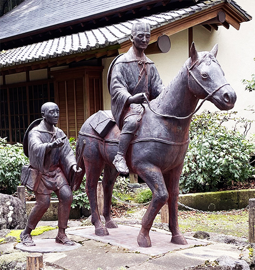 The photo shows a statue of Basho’s mode of transportation. It is installed at the entrance of the Kuroba Basho Museum. This refers to the use of horses as a means of transportation between post stations under the post station system, which was the primary mode of transportation until the Edo period. While public use was free, ordinary people, like in today’s society, had to bear the cost known as “relative fare.” This was reportedly about twice as high as the “official fare.” Even today, while members of parliament can ride in the spacious front seats of airplanes for free, ordinary people have to pay high prices for the cramped seats in the back—a remnant of that system, I think.