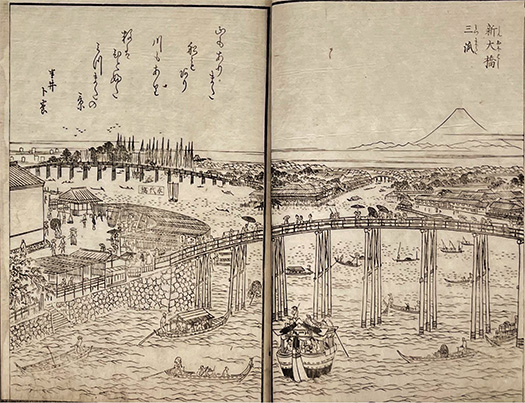 Fukagawa, on the east bank of the Sumida River in Edo, is the town where Basho lived. It is a neighborhood where traces of the actions of Matsuo Basho, a man of the past, can be found in various places. That traces of this man, who lived from 1644 to 1694, remain so vividly some 330 years later clearly demonstrates how deeply his haiku works have been cherished by the Japanese people. The illustration below shows a wooden bridge spanning the Sumida River, located quite close to where Basho’s hermitage once stood. It was named the “New” Bridge, a name that itself evokes the spirit of the times.