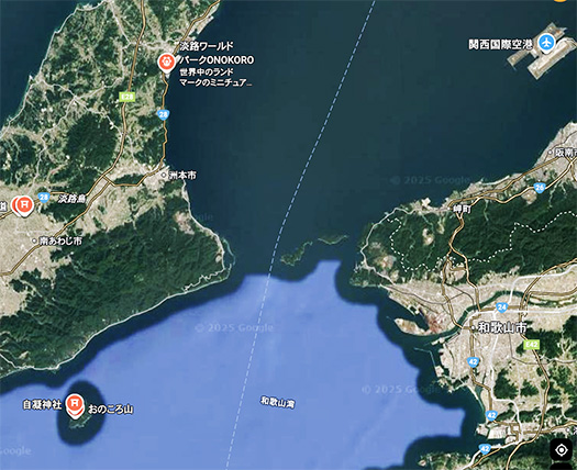 淡路島は好きで、あちこち記憶がありますが、そのなかで都市部から遠隔でまだ行けていない「オノコロ島」とおぼしき位置関係の島を確認できた。直前には淡路島と徳島の連絡橋、鳴門の渦潮の「鳴門大橋」が確認できていたので、ほぼ間違いないと確信を持った。