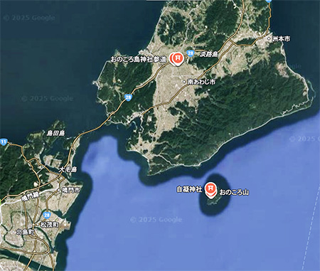 この島はその存在自体が「国生み神話」そのものでイザナギ・イザナミが矛で海をかき回して陸地をつくった創世神話のとき、その矛から落ちたしずくが固まって最初にできたとされる島。その後淡路が生成されていった。この島の名を冠した神社が、なぜか淡路島の陸地の真ん中の高速道路沿線にあって、四国旅大好き夫婦は参拝した経験もあります。たしかブログでも記述。