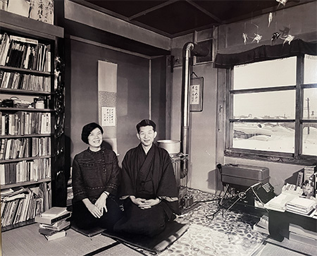 写真上は作家とご主人のツーショット。ご主人は病身であった彼女の「口述」を筆記することで、いわば二人三脚で彼女の作家活動を支えていた。口述筆記とひとことで言うけれど、実際に想像してみるとその困難さがよくわかる。やはり強い「相見互い身」という心象があって初めて成立するものだと思う。