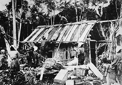 わたしの家系は30代早々の祖父と祖母、幼子2人という家族で入植したので、その居所(住宅というにはあまりにDIY的簡素さ)の建築に当たって、この写真のように近隣の方々にお手伝いいただいたことが推定できる。