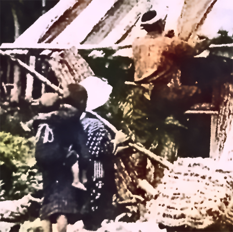 Staring intently at the black-and-white photo, I notice a young child being carried on someone’s back. The child’s legs are faintly colored, powerfully stirring my emotions. In my own family, my aunt as a child must have been carried like this. It feels as if the information conveyed by the photo suddenly becomes deeply personal.