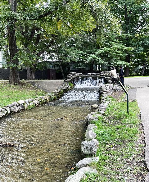 This water feature was restored through a collaborative effort between Sapporo City and Hokkaido University. They artificially channeled “underground seepage water” to revive the once-dried-up Saku-shukotoni River. As a Sapporo native, I can relate to that. Young couples also appear in the background of the photo, serving as models. I hope they subtly convey the essence of old Sapporo.