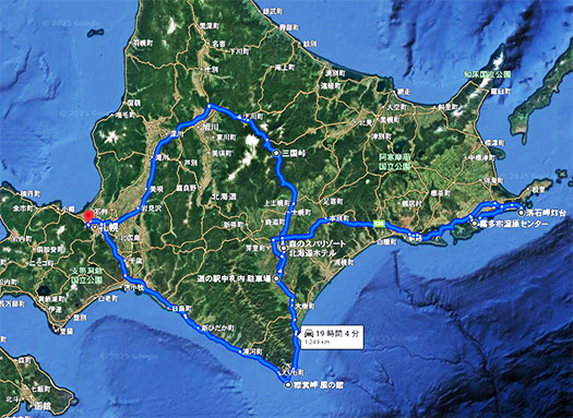 上のGoogleMapが今回の旅程。北海道の最「高地」を訪ね歩いたあと、北海道の「東端」に近い根室半島・落石〜そして「風極〜ふうきょく」と言われる、地形的に太平洋に突き出る襟裳岬探訪というコース。カミさんの行動計画に従順に従っての高齢者夫婦ドライブの旅でした。
