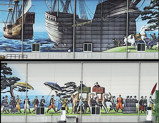 その波止場に面して、日本ノボパンという建材製造会社の本社工場が海辺に建っていて、その外周の塀に壁画 浪漫やさかい~時代を越えて通じるロマン~が描かれている。