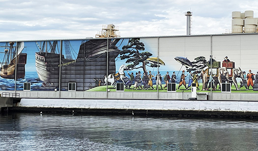 Facing the wharf, the headquarters and factory of Nippon Nobopan, a building materials manufacturer, stands by the sea. On the outer perimeter wall, a mural titled “Romantic Sakai ~ Romance That Transcends Time ~” is painted.