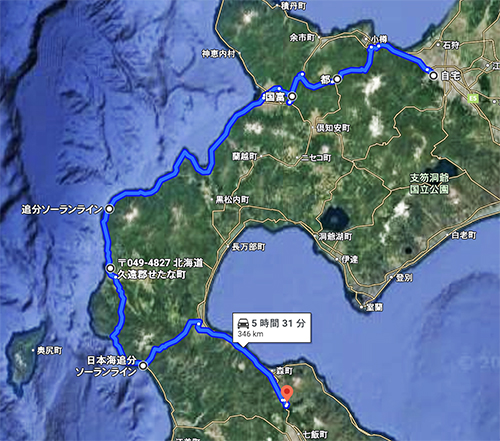 GoogleMap図のようなルート、おおむね350kmの道中でした。途中あちこちに立ち寄りして、ヒグマを怖がりながら、少しでもウォーキングもしたいと欲張り。紅葉のすばらしさに感嘆の声を上げながら、ときどき道路脇を歩いて紅葉撮影しておりました。