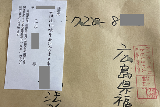 Today’s blog post is about a document I sent last week to a public agency of the national administrative organization in Hiroshima Prefecture, requesting the issuance of official documents. I thought the reply was taking a bit longer than expected, but then it came back “returned” as shown in the photo. Upon checking, it turned out to be an “address error” on my part.