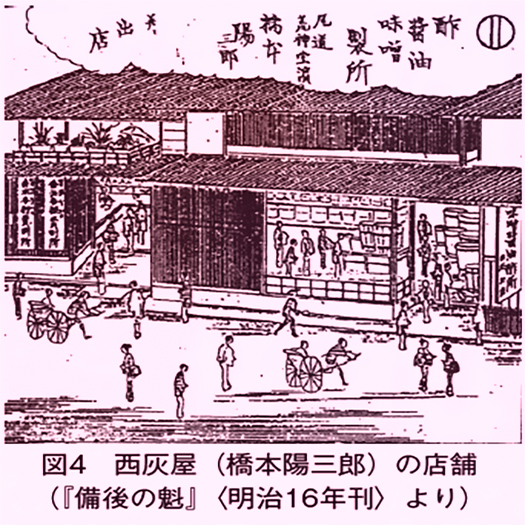 写真は、2013年頃に石見銀山地域を巡ったときに参観していた「商家」の佇まい。で、その下の絵図は昨日に続いて尾道の豪商「灰屋」の店先風景。瀬戸内海側と日本海側ですが、ほぼ同時代の空気感。