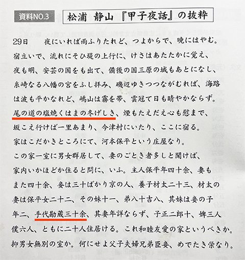 さらに江戸期の肥前平戸藩主で「甲子夜話」という記録文を遺した松浦静山公のその文章から、尾道から今津宿までの道中の塩田風景描写が見られる。そこで「わが家系の先祖」が、かれら貴人のための旅宿「本陣家」で、接遇に立ち働いている様子が活写されている。