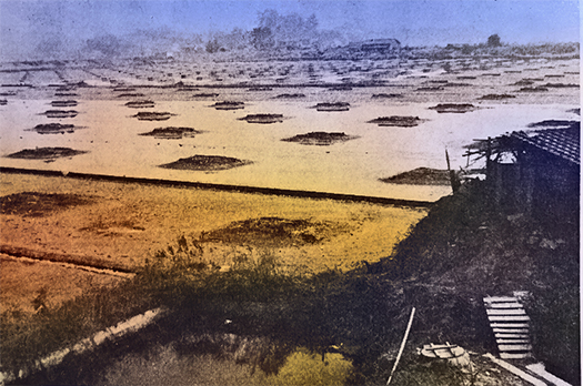 Building upon the results of our relatives’ investigative efforts, we can deepen our exploration using various modern techniques, including AI, which opens up fascinating realms of imagination. In the photographs, patterns gradually overlap, revealing our family’s deep connection to the Matsunaga and Imazu regions near Fukuyama City, adjacent to Onomichi on the Seto Inland Sea. Matsunaga, during the late Edo period, saw a boom in the Seto Inland Sea’s salt field industry, a time that also marked the true cradle of Japanese capitalism. The photo shows Matsunaga’s inlet-style salt fields from an old photograph.