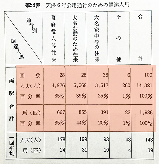 伝馬は1835(天保6)年段階で約1,000匹。人足はおおむね7,000人。AIに確認すると伝馬人足とは「人や物資の輸送のために用意された馬、およびその馬を扱う人夫(馬子)を指す。また大名の駕籠人足、重い荷物(武具、米、道具)の移動使役」。