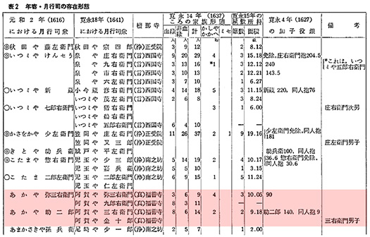 「あかや」と記されているのがわが家系がその一員になっていた「阿賀屋」で、1616-1641年当時の自治組織の「月行司衆」になっている。有力商人であるかれらは「加子役銀」という公費負担を出資している。これは港町の港湾労働に従事する人びとへの労務費などが主な用途のおカネ。阿賀屋は2名が役に就いていて10.5%の加子役銀負担割合。