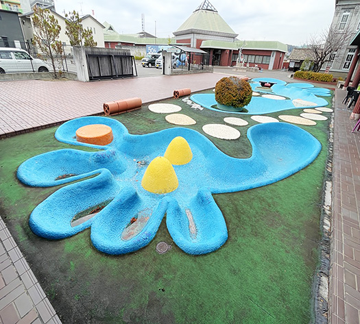 この「足あと広場」は岡本太郎の作品の中で唯一、人に踏まれる(足で触れられる)作品として知られており、非常に希少なもの。