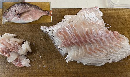 Yesterday at dawn, as announced, I wrestled with a large sea bream measuring 42cm in length. Astonished by the hardness and thickness of its bones, I somehow managed to fillet it, clumsy as I was. Before filleting, the sacred eyes of the sea bream seemed to convey an expression like, “Hey, I’ll take you on, so come at me with everything you’ve got.” A moment of complete absorption.