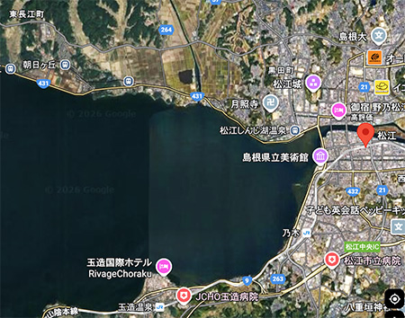 Lake Shinji stretches long from east to west. From the “sunset spots” on the Matsue city side, the sun sinks into the lake surface, and the “afterglow” that scorches the sky after it sets pierces my heart deeply.