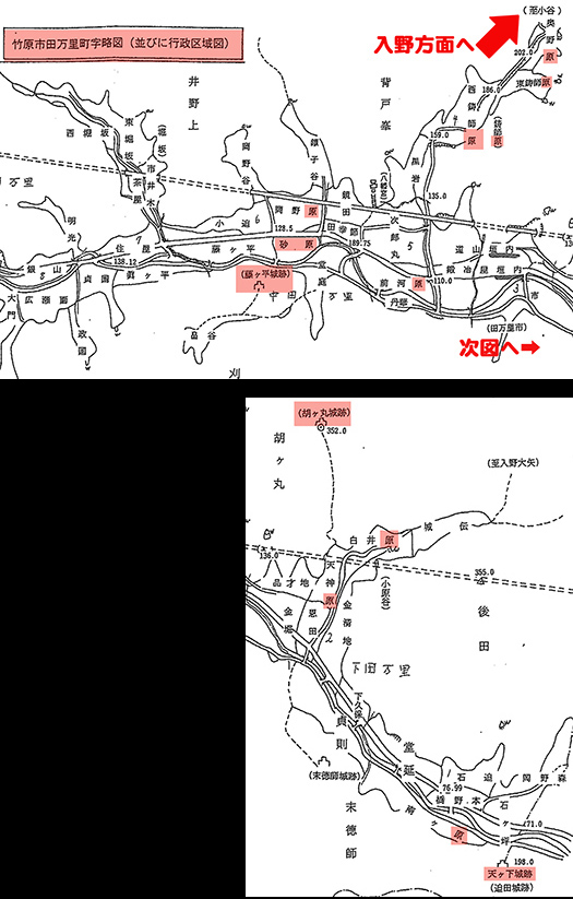 で、明治以降の1958年に竹原市に行政区画で編入されて以降の地図(上図)を見ると、字(あざ)名でたくさんの「原」地名が発見できる。砂原・岡野原・前河原・東西の鋳師原・奥野原・天神原・白井原・南ヶ原などとなっている。この田万里地域自体が〜名前の由来:「たまり」という地名は、賀茂川周辺の土砂堆積や入浜式塩田開発などと関連がある(竹原の歴史的風致より)〜ということなのですが、どうも地形の土木的改良の歴史的痕跡が、地名に残されていることが明らかと思える。