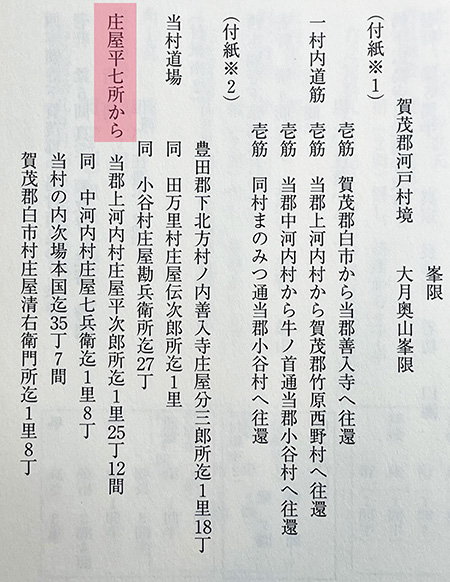 さっそく調べたら上のような記録箇所を発見。1718年段階の広島藩による入野村の「土地境界」調査記録部分ですが「庄屋平七所から・・・」という記述。これは現代文訳すると「庄屋の(原)平七の屋敷地(所)から〜」という意味。この記録年代当時、原平七が「庄屋」だった確かな記録と理解出来る記載。