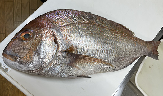 We looked around at various stalls, but just as we were about to give up, thinking, “Nope, nothing here,” we found a single, plump specimen standing proudly in the very last shop… Yes, it was practically the size of a land animal. It weighed 2 kg. It had an air about it that seemed to say, “I’ve been waiting for you, heh heh” (laughs). It looked so plump that, naturally, it was still full of innards. When I asked the shop owner, “How should I fillet this?” he replied, as if speaking the language of sea bream, “I’ve got a good trick, heh heh.”