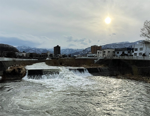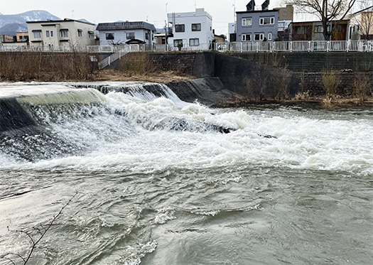 Spring has arrived in the Sapporo area, with high temperatures exceeding 10 degrees Celsius. True to the heavy snowfall of this past winter, the lingering remnants of the season have come down from the mountains as a magnificent torrent, filling the riverbanks to the brim. The familiar Kotoni-Hassamu River presents a scene so vivid that one can almost hear the roar of the water.