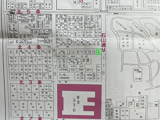This junior high school was “Ryoun Junior High School,” which once stood in central Sapporo. It was closed down as a result of the population shifting to the suburbs, leaving the city center hollowed out. Given those circumstances, alumni naturally have a certain “attachment” to the school. For that reunion, as a sort of “gimmick” that felt like time travel, I scoured the city to unearth a map clearly showing the names of detached houses and private residences as they were in 1957. After obtaining permission to reprint it, I distributed it as a four-page “large-format map” included in the reunion pamphlet. Looking back, I have to admit it was a well-thought-out project that took the occasion into account (smug).