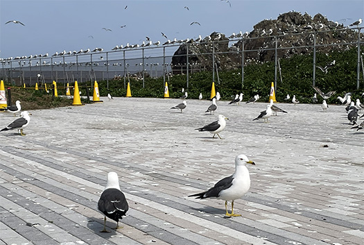 So, we headed out to explore the nature of northern Tohoku’s Pacific coast, heading toward Kabushima and the Tanezashi Coast, as seen in the photos. We were greeted by Kabushima’s famous seabirds. My wife, a huge fan of the horror in Hitchcock’s *The Birds*, was overjoyed and ran around frantically. It seems her actual fear stemmed from the “danger of bird droppings,” so her only option was to flee in panic from the attacks on her clothes.