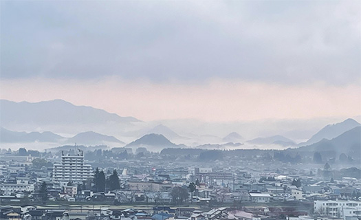 The photo above is an early morning view from the hotel in Odate, which served as our base for exploring the Akita Kakunodate, Tsugaru, and Towada areas. Odate is a city situated in a mountainous plain, surrounded by a ring of mountains. The moisture-laden air formed a sea of clouds between the mountains, creating a scene of ink-painting-like beauty.