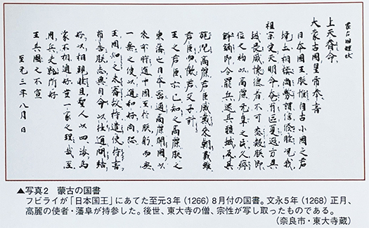 上の写真は元から日本側に送られた「国書」。最近の文書研究では元の皇帝が送った国書としては「前例のない鄭重さ」と解されている。国書冒頭に、日本国王に対して「奉る」とあり礼を尽くしている。さらに文末に「不宣」の文字があることが注目されている。これは「友人間」の定型句であってなお「臣下」としない意思を示した語句だと蒙古の文書「経世大典」に明記されているとのこと。