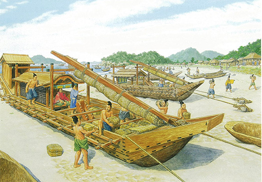 The illustration is from the booklet “Yuzuki Castle Story” published by the “Dogo Park Proud Town Development Promotion Council. The text contains the gist of the book, “Promote it greatly,” so I will use it. Drawing by Mototaro Kagawa. This painting is an imaginary reconstruction of a port in the Iyo region during the Heian period (794-1191).