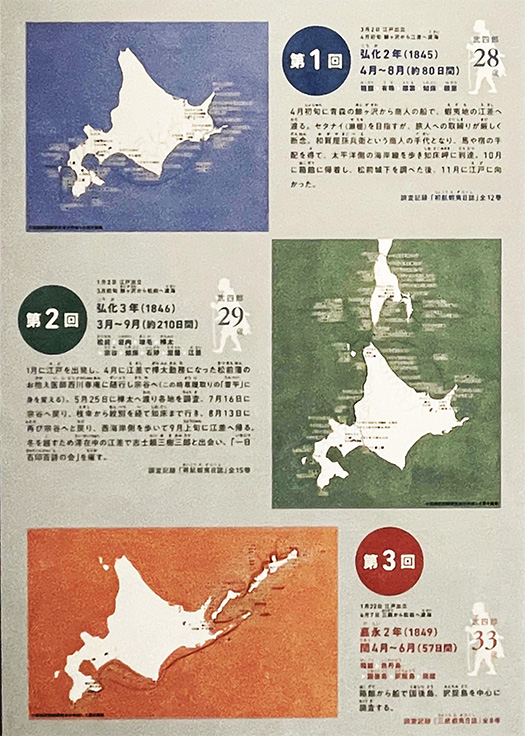 1−2回をみると北海道を知床を境にして「南部」、そして宗谷を起点にして「北部」の地形を詳細に把握する旅だったのだと確認できる。そして第3回は3年後の1849年、33歳の時に函館から船で国後・択捉を中心に探査している。