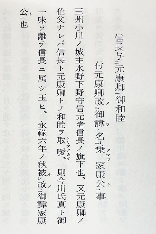 〜という軍記。徳川期になって書いたのでこの年代本来の松平ではなくて徳川になっている。「忖度」は修飾語など各所に示される。次の文書では水野氏が当時信長に臣従していたので、信長と元康との和睦をとりあつかったと誇らしげに書かれている。これを契機に元康は家康と名をあらためた、という記述。