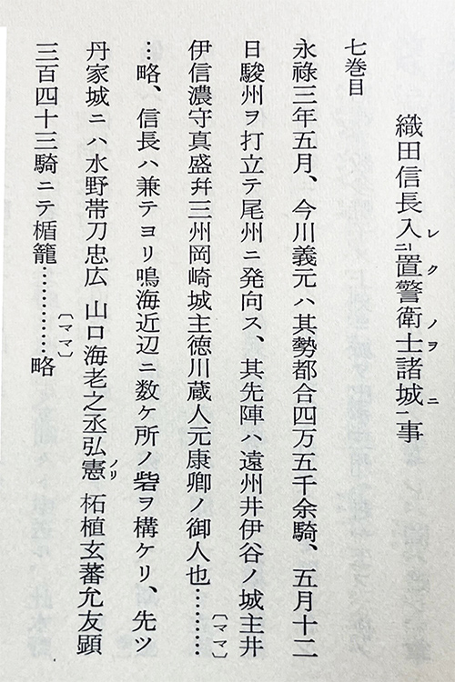 上は桶狭間合戦当時の軍勢進退についての記述。「織田信長は諸城に警衛の士を入れ置いていた事」というタイトル。永禄3(1560)年、今川義元の軍勢45,000余騎が5月12日に駿河を発って尾張に向かった。先鋒はこれも後に徳川氏に臣従する井伊真盛ならびに三河岡崎城主・徳川蔵人元康。(略)信長は・・・