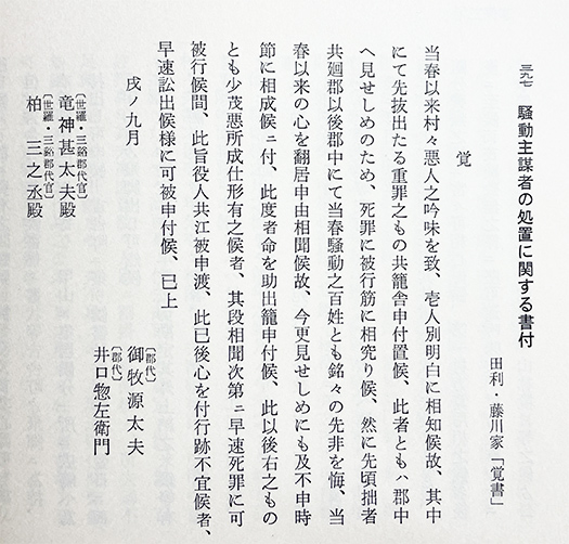 However, one month later, once the turmoil had subsided, 49 uprising leaders across the domain were executed by beheading or impalement. Another 129 were imprisoned, and many others fled into exile. The second ancient document is a transcript of the domain’s record of punishments for the uprising leaders. The phrase “immediate death penalty” reflects the ruthless cruelty typical of samurai autocracy. The incompetence and cruelty of “dictatorship” that lingers into the modern world.