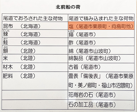 It became clear that the backbone of Onomichi’s domestic trade activities during the Edo period was the salt trade—specifically, the “Kitamae-bune trade” between the northern coastal regions of the Sea of Japan and Hokkaido.