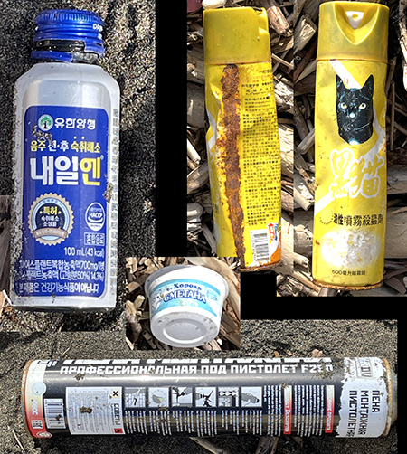 わたしが強く興味を持ったのは、日本海側海岸線にずっと連続してきている「海岸ゴミ」。この写真はそのなかで対岸側からの漂着物のいくつかをピックアップしたもの。ロシア語・韓国朝鮮語・中国語の生活廃棄物とおぼしき現代生活具が点在していた。