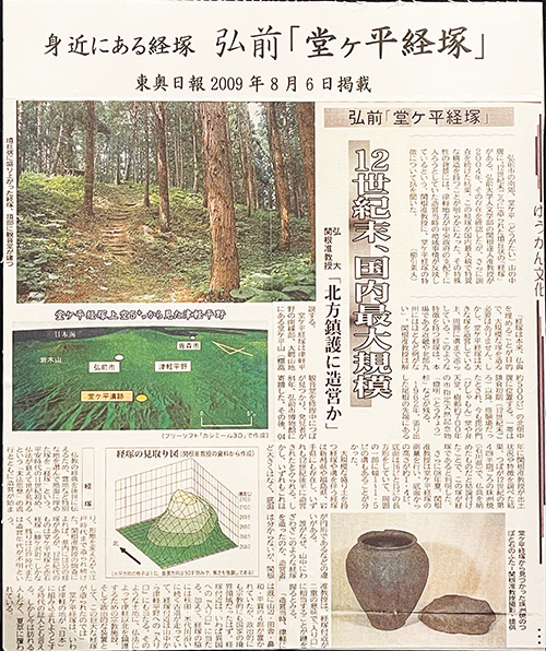 この記事では弘前大学の関根准教授に取材して、弘前「堂ヶ平経塚」の規模やその「建築意図」について、いわば仏教思想による「鎮護国家」の境界認識が埋蔵されたという趣旨の記事内容が語られていた。